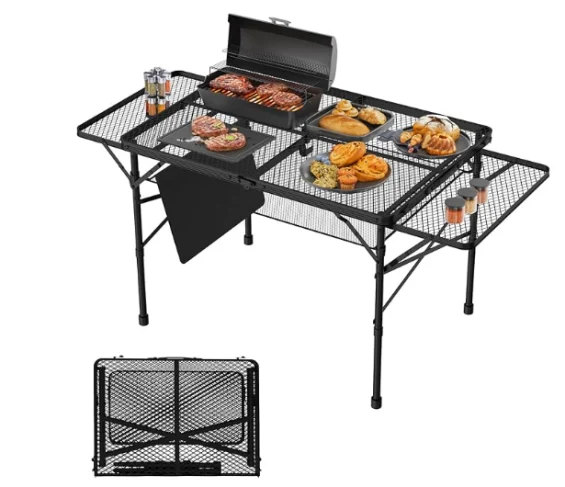 합금 캠핑 테이블 야외 접이식 데스크, 2 개의 날개 패널이있는 접이식 테이블, 메쉬 데스크탑이있는 3x2 ft 캠핑 테이블, 메쉬 백이있는 높이 조절 가능한 접이식 그릴 테이블, 피크닉, 캠핑, 바베큐, 해변을위한 휴대용 야외 테이블