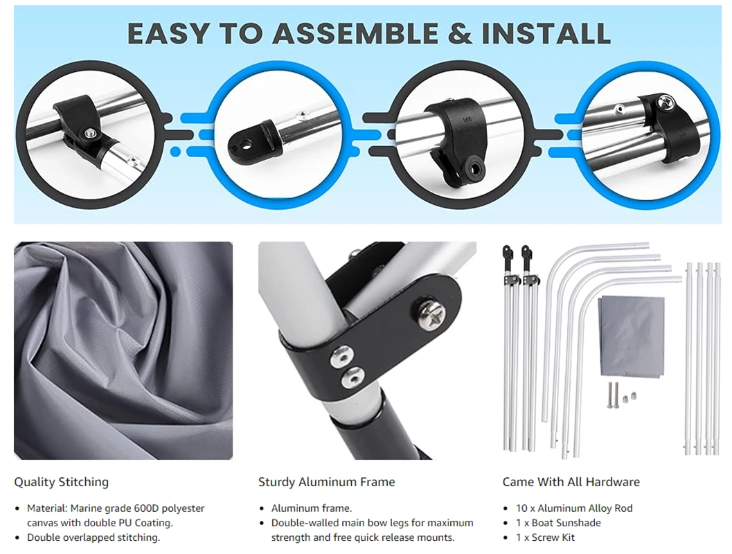 알루미늄 확장 가능한 보트 캐노피. 풍선 보트, 카누, 카약, 낚시 보트에 적합합니다. 우리의 보트 그늘은 Runabout 보트, V-Hull 보트, Jon 보트, 베이스 보트, 풍선 보트, 유리 섬유 보트에 이상적인 태양과 비로부터 당신을 지켜줍니다. Zhejiang Jiayu Outdoor Products Co., Ltd는 특별한 작업 없이 단 몇 분만에 완료할 수 있습니다. 쉽고 빠르게 설치할 수 있는 도구입니다.