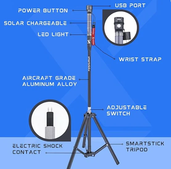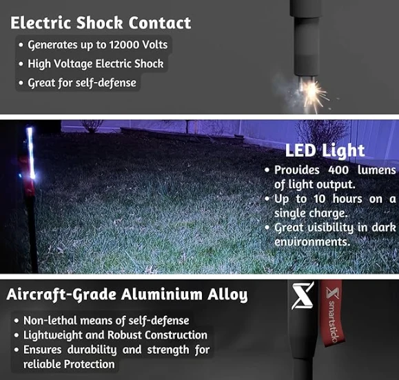LED에서 이용 가능한 두 가지 모드 : 캠핑에 완벽한 밝은 흰색 빛과 비상 상황을위한 빨간색/파란색 플래시로 야간 스틱 자체 방어를위한 효과적인 도구입니다.